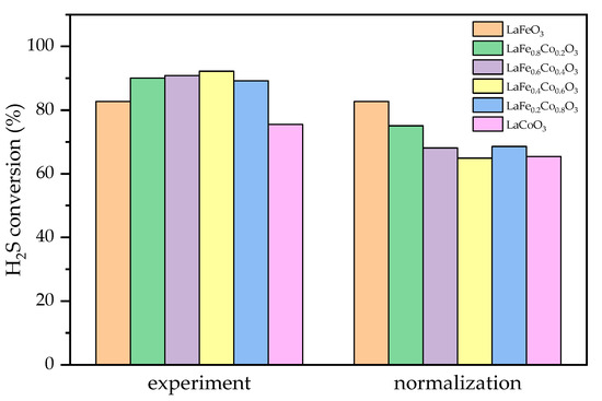Experimental and normalized H2S conversion of LaFexCo1−xO3 catalysts at 180 °C.