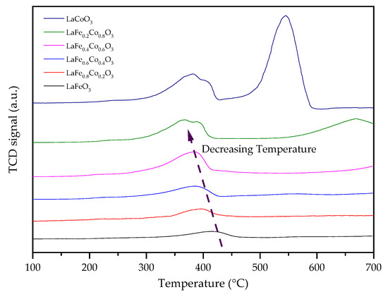 H2-TPR was conducted to determine the reducibility of the catalysts, as shown in Figure 10. It can be seen that the LaCoO3 sample has reduction peaks at 380 °C and 405 °C, which can be attributed to the reduction of Co3+ to Co2+ [34], and a higher-temperature reduction peak at 546 °C belonging to the reduction of Co2+ to Co0 [35,36]. The addition of Fe in the LaCoO3 leads to reduction peaks with lower temperatures. For example, LaFe0.2Co0.8O3 catalyst has reduction peaks at 367 °C and 390 °C. With the further increase in the Fe doping amount, LaFe0.4Co0.6O3, LaFe0.6Co0.4O3, LaFe0.8Co0.2O3, and LaFeO3 show reduction peaks in the range of 300 °C–400 °C. These indicate that the addition of Fe promotes the reduction of Co3+. As the reduction of Co3+ to Co2+ is also associated with the creation of lattice oxygen vacancies, it can be concluded that Co and Fe co-doping facilitates oxygen vacancy formation in perovskite. This is consistent with the trend of H2S conversion, which indicates that the ease of oxygen vacancy formation leads to increased catalyst activities for H2S oxidation. This result is also consistent with other literature reports [37,38]. The high-temperature reduction peak (546 °C in LaCoO3) was pushed to a much higher temperature (660 °C in LaFe0.2Co0.8O3), and completely eliminated in LaFe0.4Co0.6O3, LaFe0.6Co0.4O3, and LaFe0.8Co0.2O3 [39,40]. The higher-temperature reduction peak is associated with further Co2+ reduction to Co0, which indicates that the Co and Fe co-doped samples are highly stable even under a high-temperature reducing environment, explaining the exceptional catalyst stability observed in experiments. The reduction peak area also increased with the increase in Fe doping amount, which also indicates that Fe-doped LaCoO3 has stronger oxidation ability and a higher amount of active lattice oxygen [41].