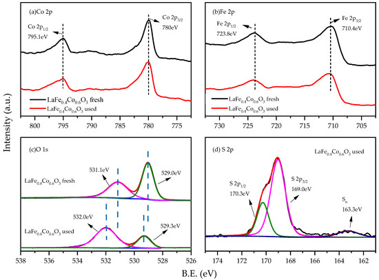 XPS analysis was conducted to elucidate the chemical states of surface Co, Fe, O, and S species of the fresh and used LaFe0.4Co0.6O3 catalysts, shown in Figure 11. From the high-resolution spectrum of Co 2p (Figure 11a), it can be seen that there are peaks at bonding energies of 795.1 eV and 780.0 eV, corresponding to 2p1/2 and 2p3/2 of Co3+, respectively [42,43,44]. Two peaks appeared at 710.4 eV and 723.8 eV in Figure 11b and can be ascribed to Fe 2p3/2 and Fe 2p1/2 levels, respectively. These binding energies agreed well with an Fe3+ oxidation state assignment [45,46]. The O 1s spectrum was shown in Figure 11c, which showed two peaks at 531.2 eV and 529.0 eV. The peak at 529.0 eV is attributed to lattice oxygen (Olat), while the peak at 531.2 eV corresponds to adsorbed oxygen (Oads) on oxygen vacancies [42,47,48]. It was reported that oxygen vacancy plays an important role in the reaction, and can not only accelerate the decomposition of oxygen molecules, but also increase the mobility of lattice oxygen [49]. It can be seen that the content of lattice oxygen decreased sharply, which confirms that the lattice oxygen of the catalyst may participate in the H2S oxidation reaction to form sulfate species. Simultaneously, the oxygen peaks were shifted towards higher B.E., with a shift value of 0.3 eV and 0.9 eV for lattice oxygen species and oxygen vacancies. As a shift to higher B.E. indicates lower electron density, this shows that the oxygen vacancies in used samples have much lower electron density. It was reported that oxygen vacancies with lower electron density lead to significantly lower ethylene yield in oxidative dehydrogenation of ethane [50]. The shift could also be caused by the formation of OH− and SO42− groups during the catalytic reaction. In this study, it is hypothesized that the deactivation of the H2S selective oxidation reaction is also mainly related to the lower electron density of oxygen vacancies. Figure 11d shows the S 2p XPS spectrum of the used LaFe0.4Co0.6O3 catalyst to investigate the deactivation process of the catalyst. Tiny peaks around 163.3 eV were detected, which can be ascribed to the presence of the conjugated sulfur (Sn) [51], indicating a sulfur deposit on the sample. The main peaks of S 2p1/2 and S 2p3/2 at binding energies of 170.3 eV and 169.0 eV indicate that S exists as a sulfate species [52]. It should be noted that deposited sulfur could also lead to catalyst deactivations.