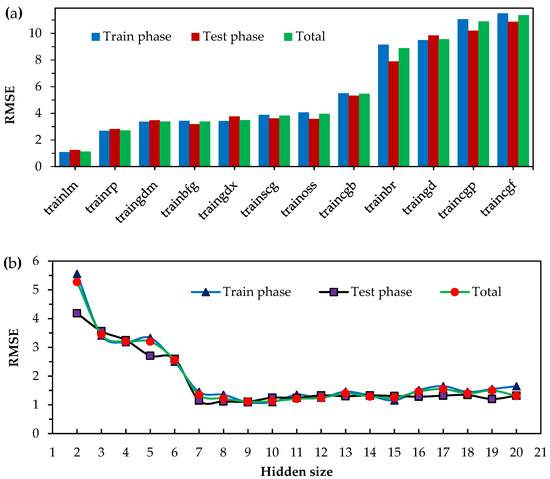 (a) Effect of training algorithm types, and (b) neuron numbers in the hidden layer on RMSE in the three stages of training, test and all data.