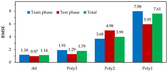 In SVM design, the type of kernel function can have an important role. RMSE values in the three stages of training, test and both stages for the four kernel functions of linear (Poly1), second-order (Poly2), third-order (Poly3), and radial bias function (RBF) are illustrated in Figure 2. It was found that the RBF function exhibits the best correlation for modelling the response (conversion). The worst result was mainly owing to the linear function, due to the nonlinear relationship between the four independent variables and the conversion. Therefore, the RBF kernel function was utilised for designing the SVM model.
