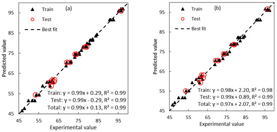 After choosing the best effective parameters of the MLP and SVM models, the prediction ability of these models was compared. Figure 3 shows the results of predicted vs. experimental data for the catalytic activity of the fabricated catalysts in the esterification reaction via MLP and SVM. The obtained regression coefficient (R2) in the two steps of training and test was higher than 98% for both models, which indicates good correlation between actual and predicted data. Therefore, both the MLP and SVM models can meaningfully predict the data in the test step.