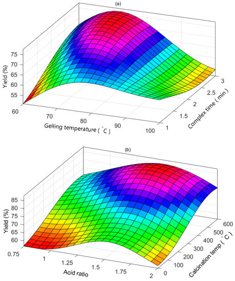 Three-dimensional plots of the effects of (a) gelling temperature and complex time, (b) calcination temperature and acid ratio interactions on the catalytic activity of the catalyst in the esterification reaction (yield).
