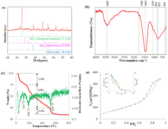 The calcium/titania-zirconia was synthesised under the optimum conditions obtained by GA (acid ratio of 1.42, gelling temperature of 72 °C, complex time of 2.65 h, and calcination temperature of 487 °C) and characterised by X-ray powder diffraction (XRD), texture analyser, Fourier transform infrared spectroscopy (FTIR), and thermogravimetric analysis (TGA)—differential thermal analysis (DTA) analyses, and the results are presented in Figure 6. The XRD pattern (Figure 6a) shows the anatase phase of TiO2 (JCPDS No. 71-1166) as major phase. Moreover, zirconia structure in monoclinic phase (JCPDS No. 83-0942) with less intensity can be detected. This may be related to good dispersion of Zr cation on the titania lattice [50,51,52]. Moreover, the diffraction peaks of CaO can be also observed, which is matched by JCPDS No. 74-1226.