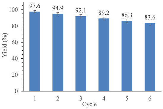 The stability of a heterogeneous catalyst is an important factor for assessing its industrial application. The calcium/titania-zirconia nano-catalyst was separated after each reaction and washed with methanol-hexane with a ratio of 1:1 vol.% to remove any remaining products and reactants from the surface and pores of the catalyst. Afterwards, the recycled catalyst was oven-dried and re-used in the next run. The results for catalyst reusability are presented in Figure 9, and it can be seen that the catalyst shows good catalyst stability in the esterification reaction. The reduction in activity after 5 cycles can be explained by the reaction between calcium oxide as base catalyst and oleic acid as free fatty acid, which possibly forms a very small portion of fatty acid salt (soap) that causes partial poisoning of the catalyst [56].