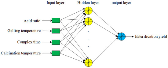 The MLP structure used for estimating the esterification yield as dependent variables and independent variables of acid ratio, gelling temperature, complex time, and calcination temperature is depicted in Figure 10. The MLP neural network consists of three layers: an input layer, a hidden layer, and an output layer [42]. In our study, an input layer has four neurons, each of which represents an independent variable. The hidden layer contains a few neurons, the number of which affects the prediction error of the esterification yield. According to the universal approximation theorem, the MLP model can predict any continuous function with any desired accuracy by having only one hidden layer and suitable amounts of neurons [65]. MLP utilises a supervised learning technique, in which the neurons of the input layer with the hidden layer and hidden layer with the output layer with the weight matrix. Adjusting the weights and finding their optimum values are the main approach for making a correlation between inputs and output [66]. For this purpose, the training algorithm was used for adjusting the weights between neurons.
