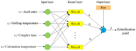 The SVM model as a nonparametric method was introduced by Vladimir Vapnik [68]. Generalisation ability is one of the advantages of the SVM model, which is why this model is also used for estimation of yield based on presented independent variables. The SVM model works based on least square, and the kernel function has the most impact on the designing and prediction errors of the SVM model. In this study, four kinds of kernel function (polynomial degree 1 (Poly1), polynomial degree 2 (Poly2), polynomial degree 3 (Poly3), and radial basis function (RBF)) were utilised [69]. The SVM structure used is illustrated in Figure 11. In the training step, quadratic programming was used for obtaining the coefficients of model 1.