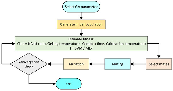 GA provides a primary population of candidate solutions in the range of studied variables [44,45]. In this study, the primary population was 50, in which the ranges of the independent variables of acid ratio, gelling temperature, complex time, and calcination temperature, were respectively set at [0.75–2], [60–100 °C], [1–3 h], and [0–600 °C]. The schematic of GA structure is shown in Figure 12. The fitness function was used for the fitness of each solution that the SVM or MLP models could be utilised for based on their accuracy analysis results. Moreover, stochastic uniform was used as the selection method for choosing the parents in the next generation. Then, scattered crossover was performed to combine two parents and produce the next generation. Gaussian method was also used for mutation which some of individuals in the population would be randomly changed during the mutation process [70].