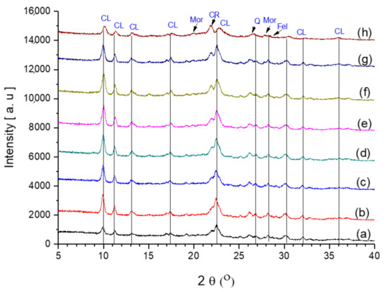 Powder XRD patterns of (a) starting clinoptilolite CLIN, (b) ammonium exchanged NH4CLIN, and the thermal treated acidic forms: (c) HCLIN250, (d) HCLIN300, (e) HCLIN400, (f) HCLIN450, (g) HCLIN500, and (h) HCLIN600. “CL”—the typical reflections of CLIN, “CR”—Cristobalite, “Mor”—Mordenite, “Q”—Quartz, and “Fel”—Feldspar [28].