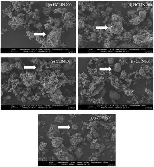 The SEM images (Figure 5) at 1000 times magnification show that the morphologies of the starting CLIN and the NH4CLIN are similar. They consist of bulky particles of up to 10 (20) µm size and show a rough surface. The bulky particles consist of agglomerated nanoparticles. The appearance of the aggregated particle changes with thermal treatment. They disintegrate into smaller particles. The surface become more porous. In part, the particles look similar to nests with holes of µm size. The reason for the changes could be the rapid evaporation of loosely bound water and ammonium ions from inter and intra crystalline small pores. This causes internal stress and partial local collapses. The particles are more separated from each other. When the temperature increases to 500 or 600 °C, the surface changes again. More small particles are formed by the disintegration of larger ones.