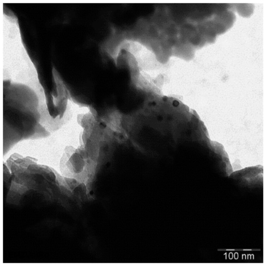 The large bulky particles of the natural clinoptilolite sample consist of a of smaller aggregated subunits as show by SEM (Figure 5). These aggregates decompose into smaller particles upon calcination, down to a size of ca. 1 µm. The TEM image of such a small particle shows that it is composed of strongly agglomerated nanoparticles (Figure 6). A part of the clinoptilolite nanoparticles looks round shaped with a size of ca. 40–60 nm (Figure 6). Another part is plate-like shaped with a thickness of ca. 10–20 nm and a length of ca. 50 nm and more (Figure 6). Hence, the clinoptilolite catalyst shows a hierarchical particle structure composed of primary crystalline clinoptilolite nanoparticles which are aggregated into µm-sized sub particles, forming finally the bulky material. The thereby formed macro pores facilitate greater accessibility to the catalyst surface.