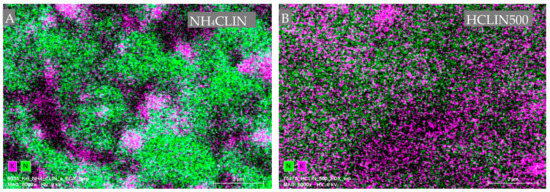 Figure 7 shows the nitrogen, i.e., ammonium ions (green dots) and potassium (pink dots) mapping images of NH4CLIN and HCLIN500. The intensity of the nitrogen dots decreases markedly after heating to 500 °C. This is in line with the observed decomposition of the ammonium ions after calcination at 500 °C as observed with FTIR, TGA and TPDA. Interestingly, the potassium ions are non-homogenously distributed and form “islands” in the image recorded with NH4CLIN. With HCLIN500, potassium dots are observed within all sample parts, however, with low density, as expected after ammonium ion exchange.