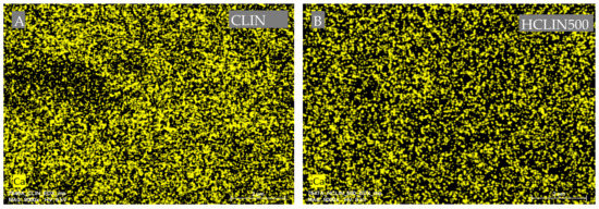 Figure 8 shows the Ca ion mapping of the starting CLIN and after ammonium ion exchange and calcination at 500 °C. The Ca2+ ions (yellow dots) are homogenously distributed throughout both of the samples. However, the yellow dots are less dense, indicating a lower calcium content with HCLIN500 caused by the ammonium ion exchange. This finding is in line with the chemical analysis.