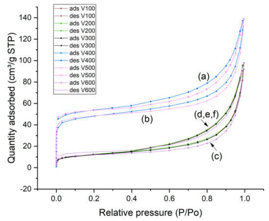 Nitrogen adsorption and desorption isotherms of (a) HCLIN400, (b) HCLIN500, (c) HCLIN600, (d) NH4CLIN100, (e) NH4CLIN200, and (f) HCLIN300.