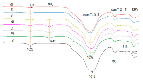 FTIR lattice vibration spectra of clinoptilolite CLIN after different treatment: (a) starting material CLIN, (b) ammonium exchanged NH4CLIN, and (c) calcined HCLIN200, (d) HCLIN300, (e) HCLIN400, (f) HCLIN500, (g) HCLIN600.