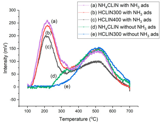 In the first step until 320 °C, ammonia is desorbed from weak BS. Thereafter, ammonia desorption continuous and reaches a maximum at ca. 520 °C followed by a decrease and tailing until 700 °C. The desorption of ammonia at higher temperatures is assigned to medium (400 °C) and strong (520 °C) acid sites. Correspondingly, the observed peak maximum indicates the presence of (very) strong BS in HCLIN catalysts. With HCLIN300, mainly weaker acid sites are liberated. These BS are stable. Re-adsorption of ammonia covers these sites again (Figure 12b) as well as in the NH4CLIN sample (Figure 12a). The total amount of desorbed ammonia with the ammonia-loaded sample is increased compared to the ammonium-exchanged sample, because ammonia adsorption occurs not only on the BS but also at weaker interacting adsorption sites in the pores. The temperature maximum of the low-temperature desorption is ca. 200 °C. Both desorption parts at low and high temperatures overlap. The low amount of ammonia desorbed from NH4HCLIN until 300 °C is in line with a low specific surface area of this catalyst. The micropores are still blocked by the ammonium ions. In contrast, ammonia desorption found with heating sample HCLIN400 to 400 °C is higher. The maximum acidity could be 1.0 mmol/g at HCLIN500 (Table 3). Microspores are opened, leading to high nitrogen uptake of these samples at low relative pressure in the micropores, i.e., large specific surface area.