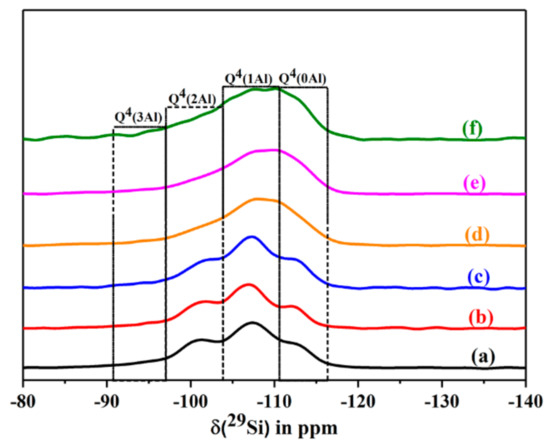 The 29Si MAS NMR spectra of dehydrated CLIN, and calcined NH4CLIN (0.5M NH4NO3 at 80 °C for 1 h, 400-600 °C) samples in dehydrated state. (a) CLIN, (b) NH4CLIN, (c) HCLIN 400 °C, (d) HCLIN 450 °C, (e) HCLIN 500 °C, (f) HCLIN 600 °C.