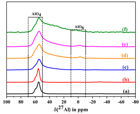 The 27Al MAS NMR spectra of dehydrated CLIN, and calcined NH4CLIN (0.5M NH4NO3 at 80 °C for 1 h, 400–600 °C) samples. (a) CLIN, (b) NH4CLIN, (c) H-CLIN-400 °C, (d) H-CLIN-450°C, (e) H-CLIN-500 °C, (f) H-CLIN-600 °C.