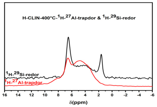 The 1H MAS NMR spectra show a broad peak in the chemical shift range between ca. 3–6 ppm which is usually assigned to zeolitic Bronsted acid sites created by Si–O(H)–Al bridges. Additionally, a signal of non-acidic isolated silanol groups SiOH appears at ca. 1.8 ppm. The signal of the protons of ammonium ions is observed at ca. 6.8 ppm. The 29Si MAS NMR Redor measurements and 27Al MAS NMR Trapdor measurements confirm the assignment (Figure 15). The signal of the silanol groups is excited via the silicon atoms in the Redor experiment but not via the aluminium atoms in the Trapdor experiment. Further, the broad signal of BS, Si–O(H)–Al groups, observed between ca. 3–6 ppm, is excited via both Al and Si atoms [40,41]. The broad distribution of BS is related with the structural disorder found with the clinoptilolite after calcination at elevated temperature. This is due to large variation of Si, Al–O–Sil bridging angles, and T–O bond distances in the clinoptilolite framework are observed. Additionally, the number of next nearest aluminium surrounding the silicon varies.