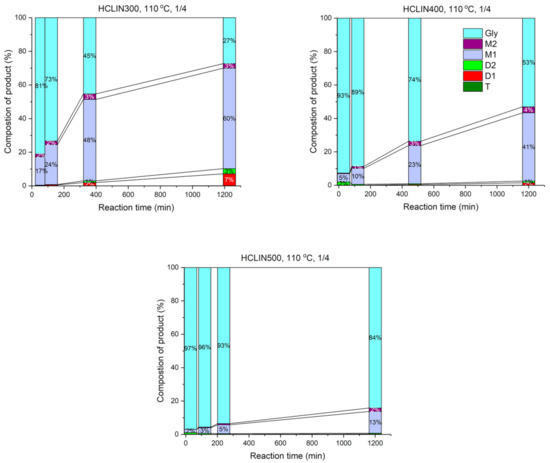 The influence of the calcination temperature of HCLIN catalysts on the catalytic performance was investigated. Figure 16 shows the composition of the reaction mixtures obtained with different activated HCLIN catalysts after 4 h of reaction at 110 °C. The highest conversion of glycerol (42%) is observed with HCLIN300, the catalyst was activated at 300 °C in short time. For the catalyst with the lowest acidity, further heating to 370 °C decreases the glycerol conversion to 34%. Interestingly, the lowest conversion of glycerol is observed with the catalysts HCLIN400 and HCLIN500. Mostly, the mono-ethers are formed. The selectivity to di-ether, the wished component, is also low. These results are surprising. The acidity of HCLIN300 is markedly lower (0.25 mmol/g) than that of HCLIN400 (0.47 mmol/g) and of HCLIN500 (0.76 mmol/g). At the same time, the specific surface area is increased from 36 m2/g to ca. 195 m2/g and 151 m2/g, respectively. Therefore, an increase in the conversion should be expected with the rising activation temperature of the heterogeneous catalyst. However, the opposite is observed. It is concluded that the strong acid sites formed at higher activation favours the formation of glycerol decomposition or polymerization products which block the active sites. This would explain the sharp decline in the conversion, especially after calcination beyond 400 °C.