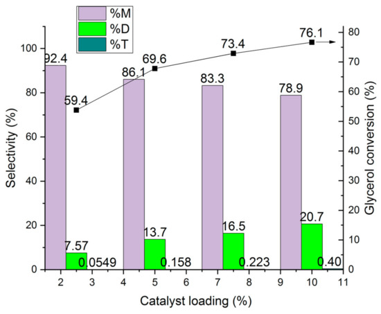 Influence of the catalyst loading on glycerol conversion to mono-ether M, di- ethers D, and tri-ether T (rare to see <1%) over HCLIN300 (catalyst calcination: 30 min).