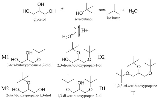 Etherification of Glycerol with tert-butanol (M- mono ether, D- di ether and T- tri ether).