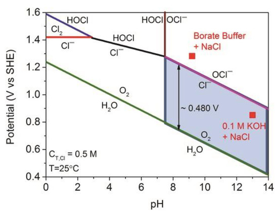 Figure 1 shows the diverse chlorine-containing products formed over the whole pH range [27]. The OER has a higher thermodynamic redox potential than the CER at all pH values. At parallel scales, a standard potential for hypochlorite formation is 480 mV higher for the OER. The major preliminary products of chlorine-oxidation are chlorine gas, hypochlorous acid (HOCl), and hypochlorite (OCl−) [28].