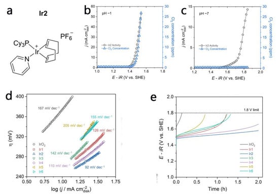 (a) Ir-based organometallics subject to pyrolysis with activated carbon: (1,5-cyclooctadiene)(pyridine)(tricyclohexylphosphine)-iridium(I) hexafluorophosphate [34]. The activity of the Ir catalyst and the concentration of produced Cl2 (b) at pH = 1 and (c) at pH = 7 (synthetic seawater) [34]. (d) Tafel slopes and (e) Stability tests of IrO2, and Ir1–Ir6 at 10 mA cm−2 [34]. Adapted with permission Ref. [34], Copyright 2020, Wiley-VCH.