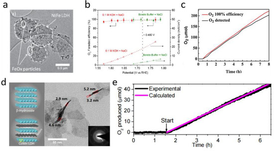 Over the years of OER catalyst development, Ni-Fe layered double hydroxide (LDH) has proved to be one of the most promising OER electrocatalysts due to its outstanding OER performance and low cost. Dionigi et al. [42] targeted Ni-Fe hydroxide, when they proposed design standards and operating conditions for seawater electrolysis. NiFe LDH achieved ~100% OER selectivity with a low overpotential (<480 mV) in a simulated seawater electrolyte (Figure 3a,b). Cheng et al. [43] designed an electrocatalyst, with Co-Fe LDH (CF LDH) nanoparticles loaded on a Ti-mesh, for seawater electrolysis at a near-neutral pH condition. The CF LDH nanoparticles exhibited advantageous electrocatalytic activity (η10 = 530 mV) and favorable selectivity for OERs in a simulated seawater electrolysis process. As shown in Figure 3c, a Faradaic efficiency of 94 ± 4% was achieved at a constant overpotential. Very few hypochlorites were generated during the catalytic process, implying that the oxidation of water to O2 plays a major part in the CF LDH–sea salt system. Liu et al. [44] improved the electrocatalytic activity of CoFe-LDH/nickel foam (NF) by doping Zr4+ in CoFe-LDH/NF, which can adjust its electron configuration and expose plentiful sites for catalytic reactions. The integration of Zr4+ can tune the use of O intermediates, reduce the crystallinity, and extend the surface area, thus benefitting oxidation processes at low overpotentials. Song et al. [45] prepared ultrathin nanoplates of cobalt manganese LDH (CoMn LDH) with high reactivity and stability (Figure 3d). The intrinsic activity of a CoMn LDH catalyst is greater than that of the Co and Mn oxide nanoparticles. The oxygen yield during OERs using a CoMn LDH catalyst was quantified in a 5-h electrolysis experiment, measured with a fluorescence O2 detector (Figure 3e).