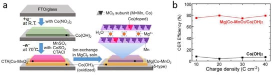 The formation of a protective layer on the reactive site of the anode material is a desirable method to effectively avoid chlorine oxidation reaction on the anode. Vos and colleagues [46] certified that coating IrO2 with a layer of MnOx can extensively enhance the selectivity of the OER. In an acid medium, MnOx/IrOx showed nearly 100% OER selectivity since the MnOx layer successfully prevented the transport of chloride ions. However, this system cannot maintain efficient operation for a long time because the inactive MnOx layer blocks the active sites of the OER [46,47]. Okada et al. [47] then demonstrated that Mg-intercalated δ-MnO2 produces a superior improvement on OER selectivity. The preparation of a heterostructured catalyst, Mg-intercalated Co-doped δ-MnO2 (Mg|Co-MnO2) overlaid on α-Co(OH)2, is shown in Figure 4a. It has been proven that this heterostructured catalyst preferentially yields oxygen. The permeation of Cl− can be effectively blocked by the overlayer of Mg|Co-MnO2 that can only transport water and oxygen, while the underlayer of α-Co(OH)2 serves as an electrocatalyst for decomposing water transported from the upper layer. The interlayer space (1 × ∞) between the MnO2 layers acts as the pathway by which water molecules reach the active sites of Co(OH)2. Consequently, Mg|Co-MnO2/Co(OH)2 delivered a supreme OER efficiency of 79% (Figure 4b).