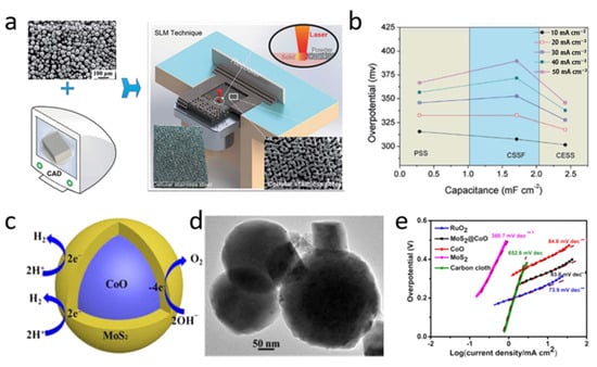 Three-dimensional (3D) porous metals have a high electrochemical surface area and exhibit advantageous electron/ion transfer. Hence, they have been attractive and effective electrodes for water splitting. For example, stainless steel is a prospective OER catalyst due to the existence of metal oxides and hydroxides on its surface, which can boost its catalytic properties [48,49]. However, the planar structure of stainless steel cannot achieve high catalytic performance on account of its low electrochemically-active surface area (ECSA) [50]. The porous 3D structure of stainless steel has received increasing attention in recent years because of its large ECSA and high porosity [51]. The application of 3D printing technology, without using any adhesive or additional processing, maximizes the OER activity of the electrode. Cellular stainless steel (CESS) manufactured by selective laser melting technology (Figure 5a) possesses high specific surface area and demonstrates superior mechanical performance [51]. More importantly, the prepared CESS electrode has good electrochemical activity, achieving an overpotential as low as ~302 mV at a current density of 10 mA cm−2 and a Tafel slope of only 43 mV dec−1 (Figure 5b).