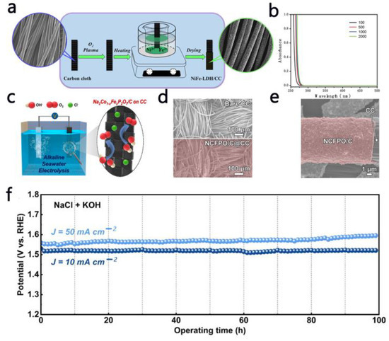 Besides the metal catalysts, the carbon-based substrate has a high electronic transfer rate and excellent tolerance to chloride ions, ensuring the efficiency of the integrated system. Dong et al. [62] synthesized Ni-Fe LDH nanosheet arrays supported on carbon fiber cloth (CC) (Figure 6a). The strong bond between the Ni-Fe LDH layer and the CC substrate gave the catalyst a high OER performance. The Faradaic efficiency of Ni-Fe LDH/CC was determined to be 97.7% in 1 M KOH solution. Furthermore, in seawater electrolysis, the Faradaic efficiency of Ni-Fe LDH/CC was calculated to be as high as 96.9% and no chlorine was detected during this process (Figure 6b), indicating that the CER was completely suppressed. Song et al. [63] designed novel carbon-coated Na2Co1-xFexP2O7 (NCFPO/C) nanoparticles as the OER electrocatalyst for an alkaline seawater electrolysis system (Figure 6c). Figure 6d,e show FESEM images of the CC before and after the dip-coating. It can be clearly observed that the NCFPO/C nanoparticles were uniformly loaded on the entire dip-coated CC. NCFPO/C@CC showed a favorable OER activity. More importantly, NCFPO/C@CC did not produce active chlorides that corrode the electrode in alkaline saline, exhibited a strong stability and endurance, and could continuously produce oxygen, as shown in Figure 6f.