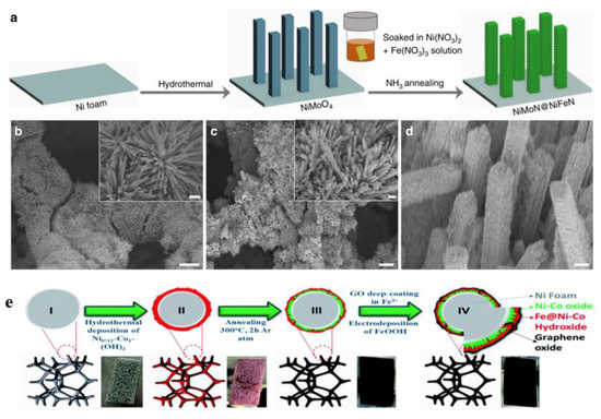 (a) Schematic image of the synthesis procedure for the NiMoN@NiFeN catalyst [66]. SEM images of (b) NiMoN and (c,d) NiMoN@NiFeN with scale bars of 30 μm, insets 3 μm [66]. (e) Schematic illustration of the preparation process [67]. Adapted with permission from Ref. [66], Copyright 2019, Springer Nature. Ref. [67], Copyright 2020, Royal Society of Chemistry.