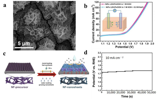 To a certain extent, the protective layer on the surface can prevent the electrode from corroding. However, when the protective layer plays a role in blocking the transport of chloride ions, it also increases the mass transfer resistance of the catalytic reaction. The in situ generation of resistant species through surface oxidation and reconstruction is an effective way to address this issue [81,82,83,84,85]. Based on this, advanced bifunctional electrocatalysts, i.e., NiFe LDH/FeOOH heterostructured nanosheets (Figure 8a), were reported to prevent seawater electrolytic corrosion [84]. The heterostructure of NiFe LDH/FeOOH can promote the production of active NiOOH species during the reaction process. Due to the strong interaction between FeOOH and NiFeLDH, and the shape of NiOOH, it not only resists corrosion due to Cl−, but also forms a strong coupling between the two phases to improve electrochemical reactivity and stability. The polarization curves of NiFe LDH/FeOOH for OERs in alkaline simulated seawater splitting are shown in Figure 8b. When NiFe LDH/FeOOH was used as both the cathode and anode, it exhibited excellent long-term operational stability, and operated for 105 h at a large current density of 100 mA cm−2.