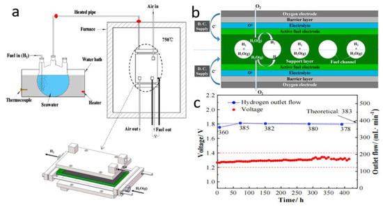 - Liu, Z.; Han, B.; Lu, Z.; Guan, W.; Li, Y.; Song, C.; Chen, L.; Singhal, S. Efficiency and stability of hydrogen production from seawater using solid oxide electrolysis cells. Appl. Energy 2021, 300, 117439. [Google Scholar] [CrossRef]