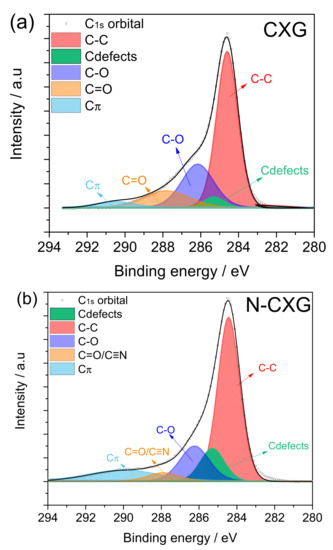 Figure 3 depicts the spectra for the C1s contribution of each carbonaceous material. The three-carbon materials presented five to six contributions: (1) C-C non-functional structures (284.6 ± 0.2 eV); (2) C defects moieties attributed to carbon atoms located in defective regions (285.5 ± 0.4 eV); (3) C-O from carbon present in phenolic, alcoholic or ether groups (286.7 ± 0.3 eV); (4) C=O from carbon in the form of carbonyl, quinone groups (287.8 ± 0.2 eV); and (5) Cπ transition interband or plasmon peak (290 ± 0.3 eV). For the nitrogen-doped material, N-CXG, the contribution of C bonded to N (C≡N) appears at 288.4 eV, so it cannot be distinguished from the contribution of C=O, being both of them included in the same peak in Figure 3b. For the sulfur-doped carbon material, an additional peak at 286.8 eV is included, related to carbon bonded to sulfur (C-S).