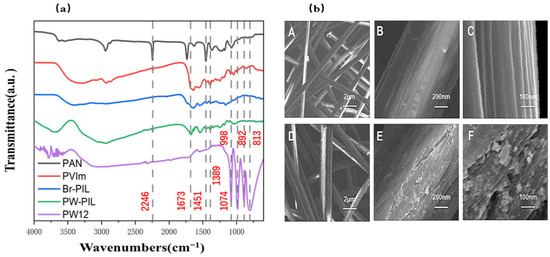 (a) FT-IR spectra of PAN, PVIm, Br-PIL, PW-PIL and PW12. (b) SEM images of PAN NF membrane (A–C) and PW-PIL NF membrane (D–F) with 2 μm, 200 nm and 100 nm magnification.