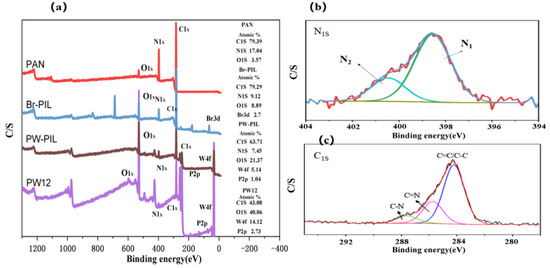 (a) XPS survey spectra of PAN, Br-PIL, PW-PIL and PW12; (b) high-resolution XPS spectra of N1s in PW-PIL; (c) high-resolution XPS spectra of C1s in PW-PIL.