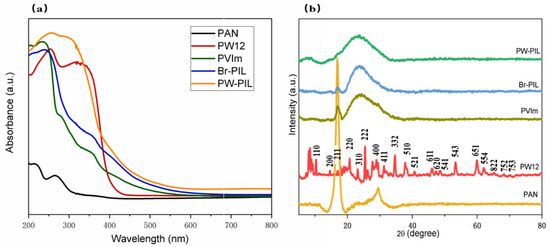 (a) The UV-vis diffuse reflectance spectra of PAN, Br-PIL and PW-PIL, PW12. (b) XRD patterns of PAN, PW12, PVIm, Br-PIL and PW-PIL.