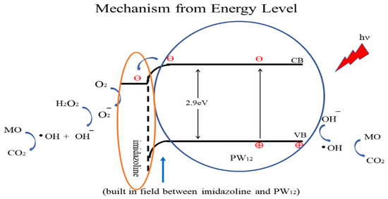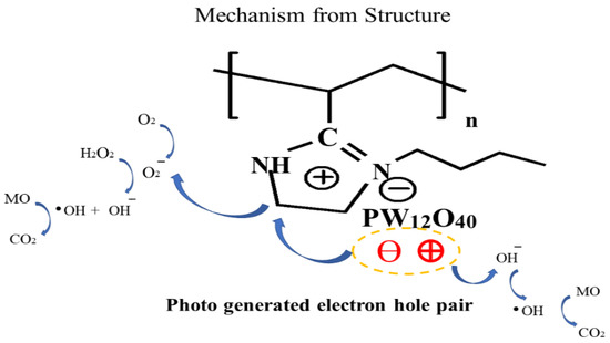A potential mechanism from aspects of molecule energy and structure is given in Figure 5 and Figure 6. The bandgap energy between energy bands of PW-PIL is 3.09 eV (Kubelka–Munk theory) according to the UV-vis diffuse reflectance spectra, indicating that PW-PIL can effectively absorb visible light [54]. As the imidazolinium groups with the positive charge can seize the negatively charged PW12 via coulombic interaction, a built-in field could be formed between PW12 and PIL chain, which would enhance the transfer of photo generated electrons. It is known that POM can be considered as a low dimensional semiconductor structure [55]. Under visible light irradiation, electrons of PW12 excite from valence band (VB) energy level to conduction band (CB) energy level, and the photogenerated electrons entering CB energy level react with O2 on surface to form O2−, while the photogenerated holes of VB level react with OH− to form ·OH, which further degrades MO. H2O2 acts as an initiator to form ·OH with O2− [56,57,58].