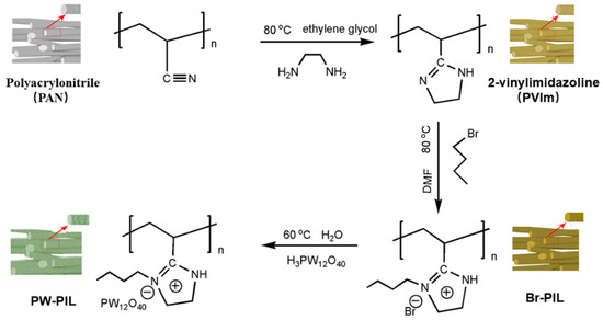 The synthetic route of PW-PIL NF membrane is shown in Scheme 1. Briefly, the PAN NF membrane was fabricated using an electrospinning method, and their cyano groups were converted to imidazoline moieties via cyclization with ethylenediamine. The obtained poly(2-vinylimidazoline) (denominated as PVIm) was subsequently ionized by 1-bromobutane to give Br-based poly(ionic liquid) (Br-PIL), which was further anion exchanged with phosphotungstate acid PW12 to obtain the PW-PIL NF membrane.