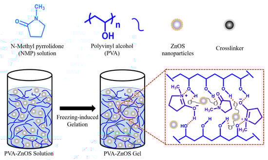 Figure 1 shows the fabrication process of PVA-ZnOS hydrogels. Different ZnOS powder amounts (100 mg, 150 mg, 200 mg) were dispersed into 30 mL N-methyl pyrrolidone (NMP) by 10 min sonication followed by 10 min stirring under ambient conditions. Then, 1.5 g of polyvinyl alcohol (PVA) (MW 130,000, 99%, hydrolyzed, Sigma Aldrich Inc., St. Louis, MO, USA) was added into the above mixture in a round-bottom flask and submerged into a 110 °C oil bath for 60 min to achieve complete dissolution of PVA polymers. Next, 10 g of the hot milky solution was poured into a Petri dish (85 mm diameter) and kept in a refrigerator at −10 °C overnight. Obtained hydrogels were submerged into the deionized (DI) water for another 24 h with frequent changes of DI water to remove NMP solvent from gels [22].