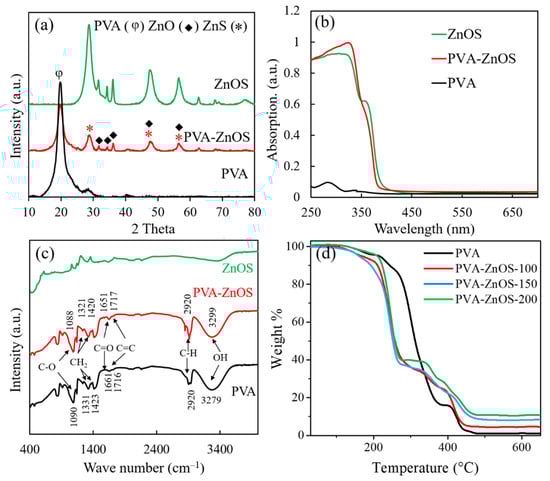 (a) XRD pattern of pure PVA, ZnOS, and PVA-ZnOS100; (b) UV-vis absorption spectra of PVA, ZnOS, and PVA-ZnOS100; (c) FTIR spectra of PVA, ZnOS, and PVA-ZnOS100; and (d) TGA analysis of PVA and PVA with different ZnO-ZnS contents.