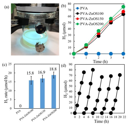 (a) Photograph of photocatalytic-reactor-contained PVA-ZnOS gel under UV radiation; (b) H2 generation as a function of radiation time from pure PVA and PVA-ZnOS; (c) average production rate of H2 of all samples; (d) Recycling test performed with PVA-ZnOS200.