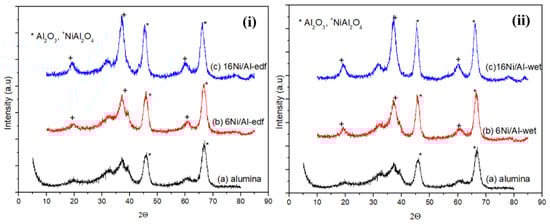 XRD patterns for (i): (a) γ-alumina, (b) 6Ni/Al-edf, and (c) 16Ni/Al-edf, and (ii) (a) γ-alumina, (b) 6Ni/Al-wet, and (c) 16Ni/Al-wet. All samples calcined at 800 °C.