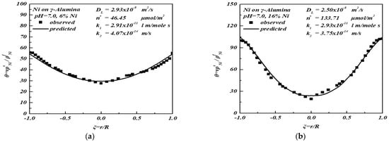 The impregnation processes have been described by numerous mathematical models [50,51,52,53,54,55,56,57,58], which incorporate several factors that determine the active phase’s content and the final profile of its macro-distribution, including (i) time of impregnation; (ii) pH, temperature, and initial concentration of the impregnating solution; (iii) the use of additives; and (iv) the previous state of the support [50]. Whereas, historically, many earlier studies were focused on the description of the “diffusion-adsorption” mechanism that controls the active phases profile deposited into formed support material particles adopting simple adsorption mechanisms, later attempts were focused more closely on the physical process of adsorption [7,56,59]. Despite the high number of models available in the literature and the diversity of their complexity, there is still a lack of models that combine detailed descriptions of the imbibition, diffusion, and adsorption processes.