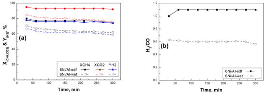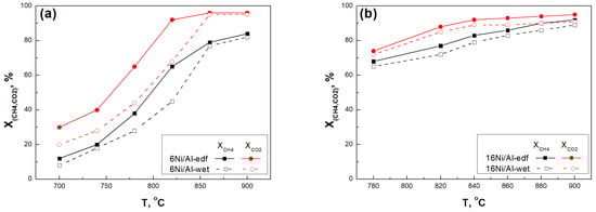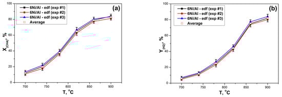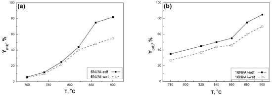 Table 1 presents the physicochemical properties of xNi/Al-edf and xNi/Al-wet catalysts. In all cases, the specific surface area values are significantly lower than that of the supporting material (γ-Al2O3, 195 m2 g−1), which is because the internal surface area of the pore system of the support is gradually covered by Ni species that are adsorbed on alumina active sites, forming a layer [23,24]. As this process continues, and a monolayer is being formed, nickel species are no more deposited through adsorption, and thus the micropores are blocked. These results are in line with those obtained by Rahmani, et al. [72] for a similar Ni/Al2O3 catalyst system. Thus, the catalysts with the lower nickel loadings (6 wt%) exhibit higher surface areas and smaller nickel species particle sizes, in comparison with the ones with higher metal loadings (16 wt%). However, especially at low metal loadings, the reduction in the specific surface area is higher for the catalysts with the uniform nickel concentration profile. This finding is attributed to the fact that for the catalytic samples prepared by the modified EDF technique, the Ni species were mostly adsorbed at the surface γ-Al2O3 adsorption active sites during the impregnation step, which means that the proportion of Ni species deposited during the drying process was rather small. As for the ICP results, Table 1 shows that the Ni concentration was approximately 6 and 16 wt%, for the low and high loading, respectively, i.e., very close to the nominal one.