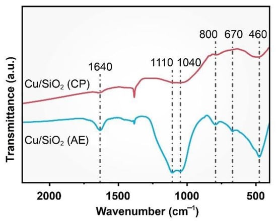 FT-IR is further used to determine the existence of copper phyllosilicate. The FT-IR spectra of calcined Cu/SiO2 catalysts are shown in Figure 2. The absorption bands at 1110, 800 and 470 cm−1 correspond to various vibration modes of the Si-O-Si bonds of amorphous silica []. The support of the catalyst prepared by the co-precipitation method and ammonia evaporation method exists in amorphous form. The band at 1640 cm−1 corresponds to the vibrational mode of the -OH of adsorbed water [,]. The existence of absorption bands at 1040 cm−1 and 670 cm−1 indicates the existence of the copper phyllosilicate []. The absorption band at 1040 cm−1 is ascribed to the vibration mode of Si-O bonds, and the absorption band at 670 cm−1 results from the vibration mode of -OH bond. The relative amount of copper phyllosilicate of the δOH band at 670 cm−1 and the νSi-O band of amorphous silica at 800 cm−1 (I670/I800) [] are shown in Table 1, which indicates the ratio of copper phyllosilicate. Clearly, the Cu/SiO2 (AE) catalyst shows more copper phyllosilicate. The formation of copper phyllosilicate indicates the metal–support interaction between copper and the support, which is corroborated by the report that copper can insert into the framework of the silica support and connect to it through chemical bonds []. The existence of this structure is related to the formation of a catalyst with a high dispersion, which is consistent with the results of TEM (Figure 1).