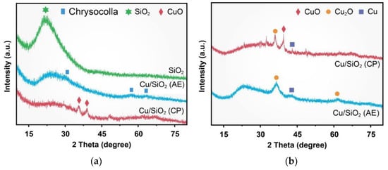 The XRD patterns of calcined Cu/SiO2 catalysts are shown in Figure 3a. The two Cu/SiO2 catalysts have similar diffraction patterns to pure SiO2. For the Cu/SiO2 (CP) catalyst, clear CuO diffraction peaks at 35.3° and 38.7° (JCPDS 05-0061) [,] are found, which indicate larger CuO nanoparticles. However, no clear CuO diffraction peaks are found for Cu/SiO2 (AE) catalysts, indicating that no aggregated CuO particles exist. Additionally, the peaks for Cu/SiO2 (AE) catalysts at 31.0°, 57.0° and 64.1° are assigned to the copper phyllosilicate [], indicating that copper phyllosilicate is formed after calcination, which is consistent with the results of FT-IR.