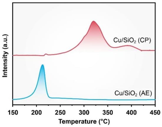 The H2-TPR profiles of Cu/SiO2 catalysts are shown in Figure 4. All samples are calcined in flowing air at 450 °C for 4 h to ensure oxidized Cu species. H2-TPR shows that the reduction temperature for CuO over the Cu/SiO2 (CP) catalyst is at 300–420 °C higher than the reduction temperature for the reported Cu-based catalyst [,]. This may be due to the reduction of bulk CuO []. The Cu/SiO2 (AE) catalyst shows a reduction peak at 180–230 °C, which is related to the reduction of the high dispersion and small size of CuO according to the literature [,,]. The XRD results of the Cu/SiO2 (CP) catalyst show that CuO is present after reduction. However, no CuO exists for the Cu/SiO2 (AE) catalyst after the same reduction process, which is consistent with the H2-TPR results. TEM results show that the particle sizes of the Cu/SiO2 (AE) catalyst and Cu/SiO2 (CP) catalyst are 3.2 nm and 5.4 nm, respectively. The easy reduction of Cu/SiO2 (AE) may be due to its small particle size and uniform dispersion.